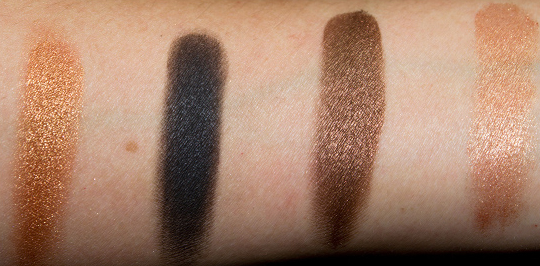 This is a warmer palette–very bronze indeed–that will suit medium to dark skin tones with yellow undertones best, but I do think it’s suitable for lighter complexions as a few of the shades are softer/sheerer. There are at least two shades (Gold Nugget and Tiger’s Eye) that I could see turning rather orange on pinker complexions, though. Fans of bronzes, earth tones, and metallic-like finishes will find this palette right up their alley, but those who prefer softer, subtler finishes may find this one too sparkly.