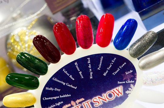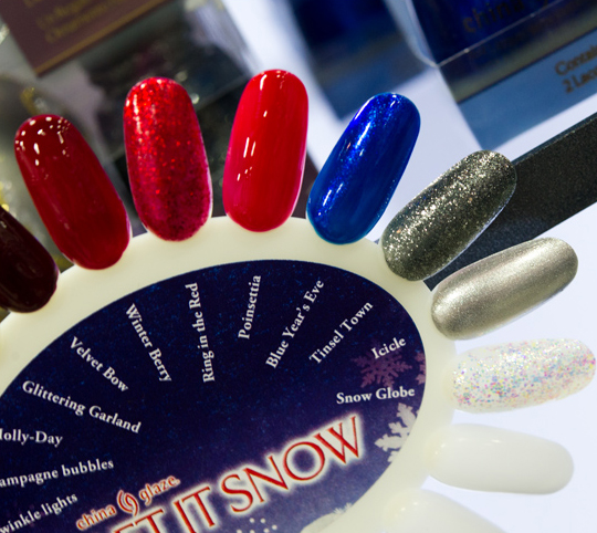- For the holidays, we’ll see a collection called Let It Snow. China Glaze has several polish sets that also include another goody (like a pair of finger-less gloves), but you can also purchase the shades individually. We’ll be seeing: Twinkle Lights (multi-colored glitter), Champagne Bubbles (gold), Holly-Day (dark green), Glittering Garland (green), Velvet Bow (ruby red), Winter Berry (red), Ring in the Red (glittery red), Poinsettia (red), Blue Year’s Eve (blue), Tinsel Town (silver glitter), Icicle (silver), and Snow Globe (multi-colored glitter). Also, in November, we’ll see six shades of glitter shades come out in Eye Candy, including such shades as Material Girl, Marry a Millionaire, Some Like It Haute.