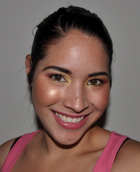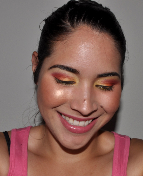 - Eyes: Soft Ochre paint pot (neutral beige base), Melon pigment (peachy-pink), Going Bananas eyeshadow (yellow), Fab & Flashy eyeshadow (orange), Rule eyeshadow (orange), Passionate eyeshadow (dark hot pink), Coppering eyeshadow (reddish-orange), Femme-fi eyeshadow (highlighter), Blacktrack fluidline (black), Urban Decay Honey 24/7 Liner (gold), Plushlash mascara (black)