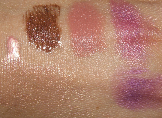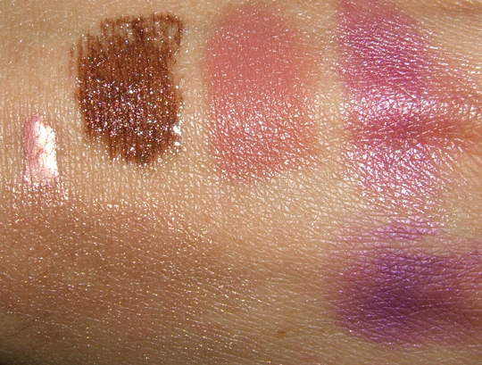 Pink Rebel Lustre Drops, Style Warrior Lipglass, Brave New Bronze Lipstick, Purple Rite Lipstick, Vibrant Grape Eyeshadow (bottom right)