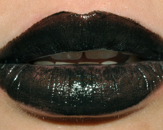 Bottom Line: Apply a thin layer of concealer or foundation (or MAC Lip Erase, which serves the same purpose) to lips.  This helps to neutralize your natural lip color and make whatever you’re applying much more pigmented, but it also evens out the surface a little more and adds a dry layer.  Black Knight has a lot of natural glossiness to it, which makes it easy for the color to slip and glide, creating that uneven look.  Use either a very dark or a clear lip liner all around the edges of the lips to help prevent the intense color from bleeding.  Then, apply Black Knight using a lip brush.  Layer until satisfied.  Be cautious when applying gloss, because the gloss tends to shift the color around in a slip-slide fashion.